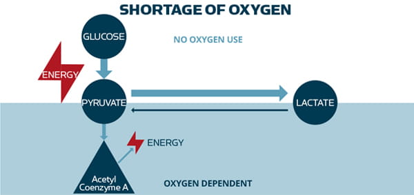 The body’s cells produce energy by converting glucose into pyruvate, which is then converted into Acetyl Coenzyme A – the body’s main energy source [5]. The last part of the process is oxygen dependent. When oxygen levels are insufficient, pyruvate is metabolized into lactate [5].