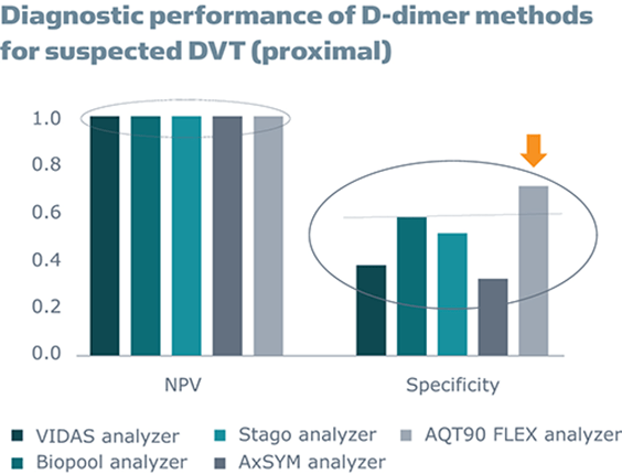 - A very high specificity (a low number of false positive results), which means less unnecessary and costly imaging on patients without VTE, and more time to spend on the patients who do, in fact, have VTE.